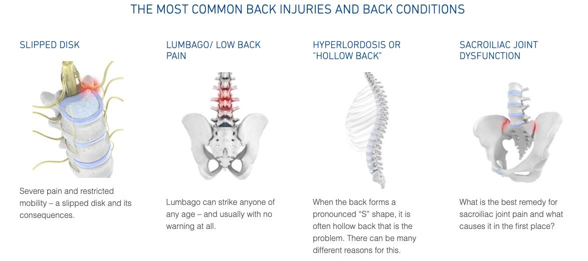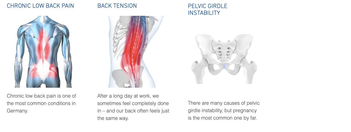 The human back supports the upper body and head, is often used to carry loads such as shopping or when moving a closet, and it gives us stability and makes us strong. It is not until something goes wrong and our back stops cooperating that most of us realize just how much we expect of our back and take it for granted. If we put our back under excessive strain or constantly use it in the wrong way, we generally end up with a back complaint, which could be anything from lumbago or severe tension to a problem with the sacroiliac joint.