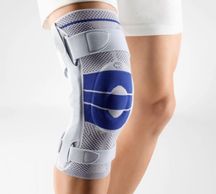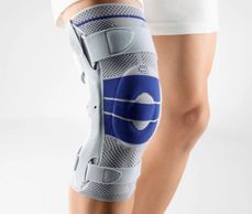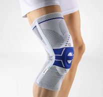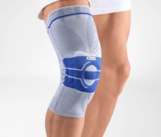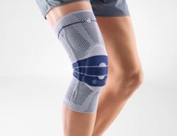 The GenuTrain S orthopedic brace with lateral joint splints supports the knee joint for indications of slight instability, arthritis or osteoarthritis of the knee. An integral, ringshaped pressure cushion (pad) surrounds the kneecap, while the interplay of the knit and the pad provides intermittent compression massage, thereby activating the musculature and stimulating the healing process. The combination of joint bars and a strap system in the GenuTrain S provides added passive support for the knee.